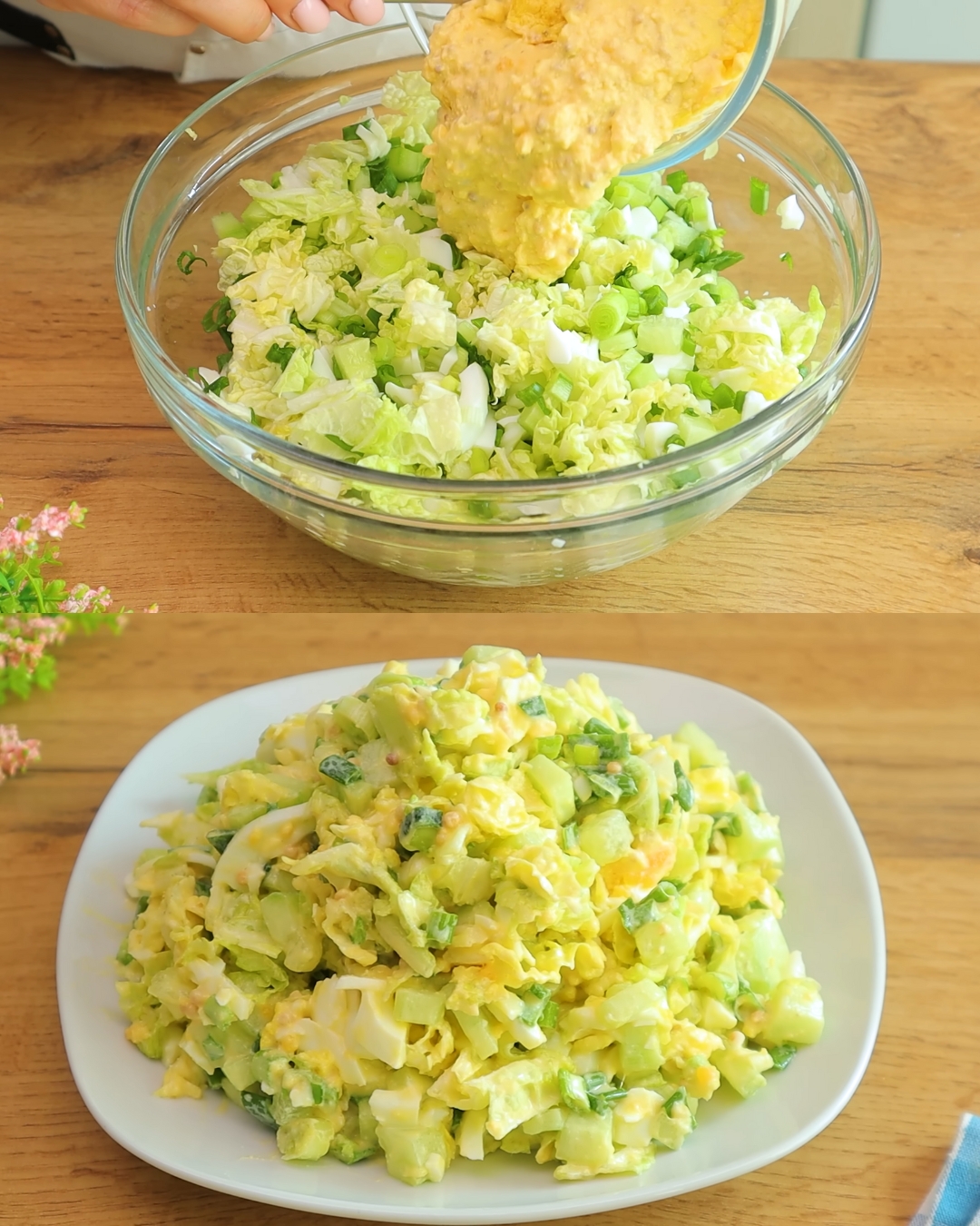L’insalata di cavolo cinese e uova è un piatto rinfrescante e nutriente, perfetto per un pasto leggero o come contorno. La combinazione di cavolo tenero, cetriolo croccante e condimento cremoso rende questo piatto delizioso.