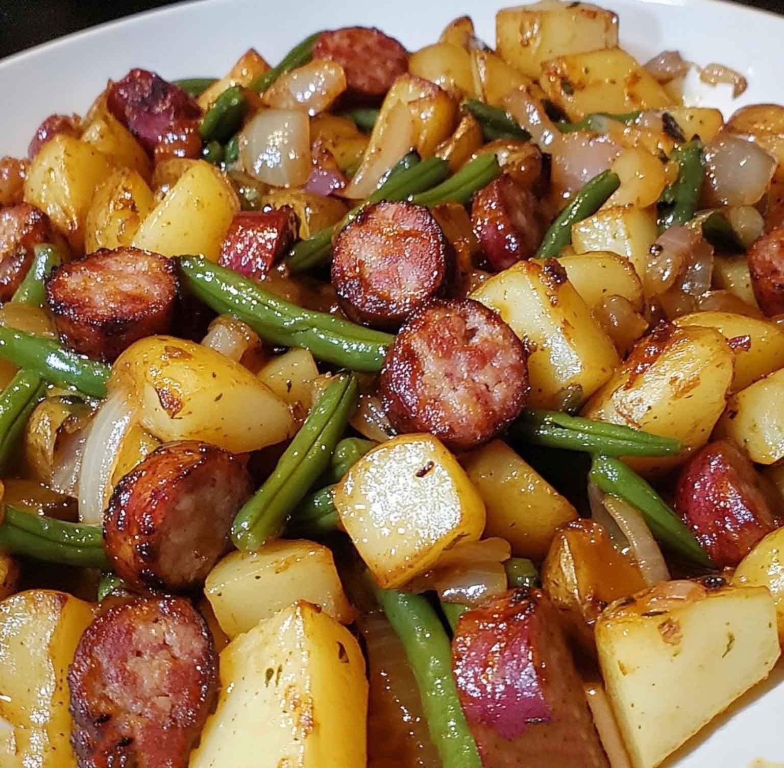 1. Preriscaldare il forno a 200 °C (riscaldamento superiore/inferiore). Rivestire una teglia con carta da forno. Disporre le patate tagliate a metà, i fagiolini, gli spicchi di cipolla e le fette di salsiccia in una ciotola capiente.